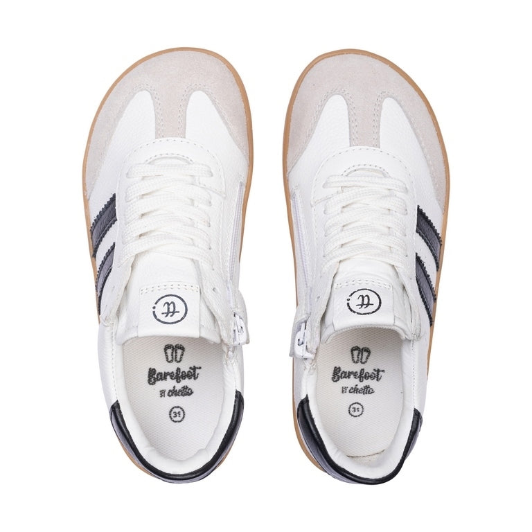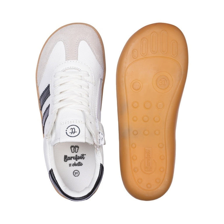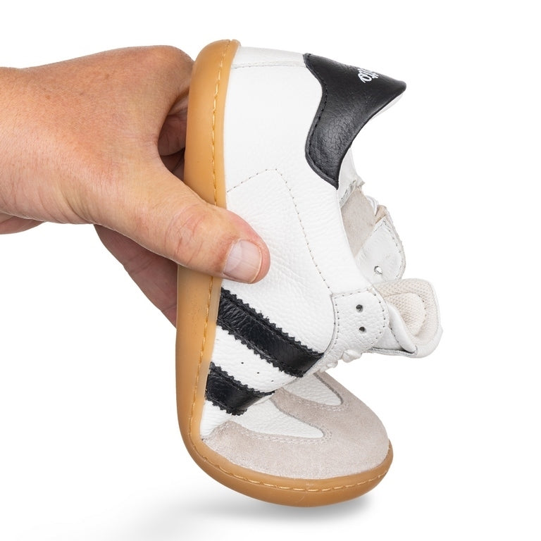 Fabricado em couro, este modelo é prático e confortável, com tira de velcro e atacadores elásticos que facilitam o calçar e descalçar.